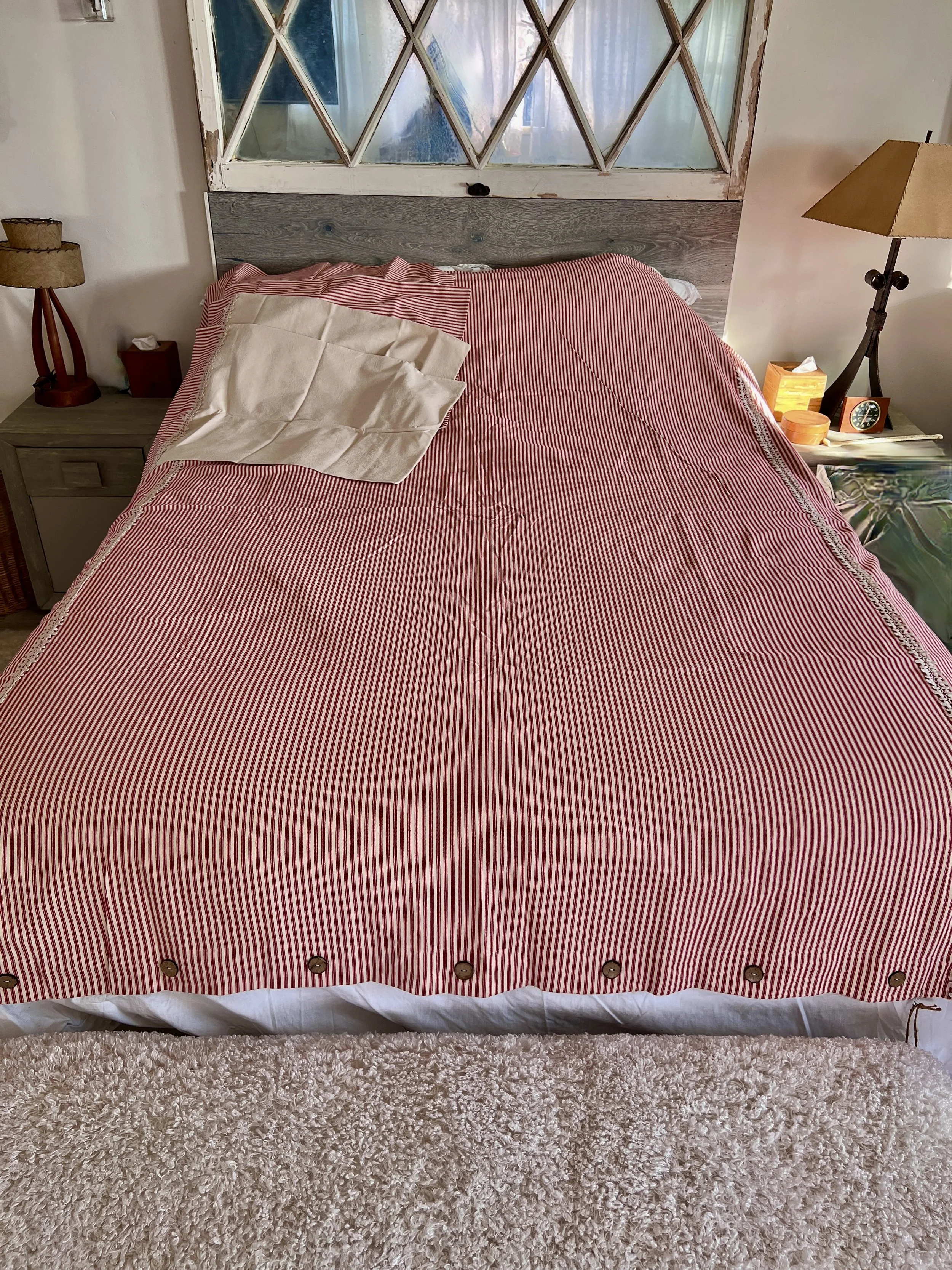 classic, nostalgic, inviting…queen size bedding set …duvet cover of red striped classic ticking, reverse natural unbleached organic cotton. 4 queen sized pillow cases: two of red ticking, the other two natural cotton, all with contrasting borders. beautiful belgian tatting detail trim on duvet cover and pillow borders. coconut shell button closures on duvet cover. approx 90” X 92”. h047