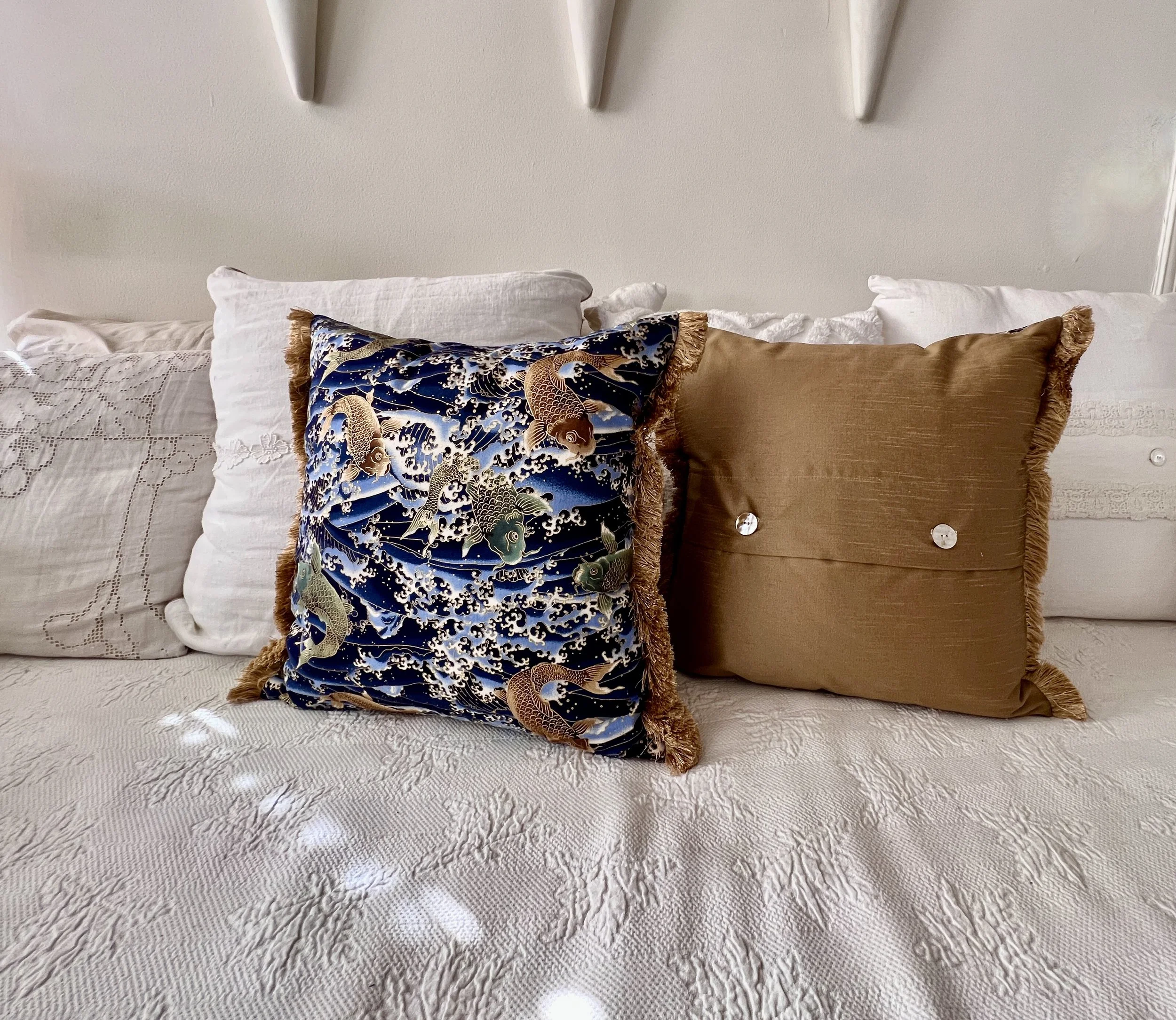 set of pillow covers: beautiful and color blue and deep pink koi fish jumping through splashing waters. backed in green dupioni silk. mother of pearls buttons. silk trim. fully lined. shown with 20” x 20” inserts (not included) h160