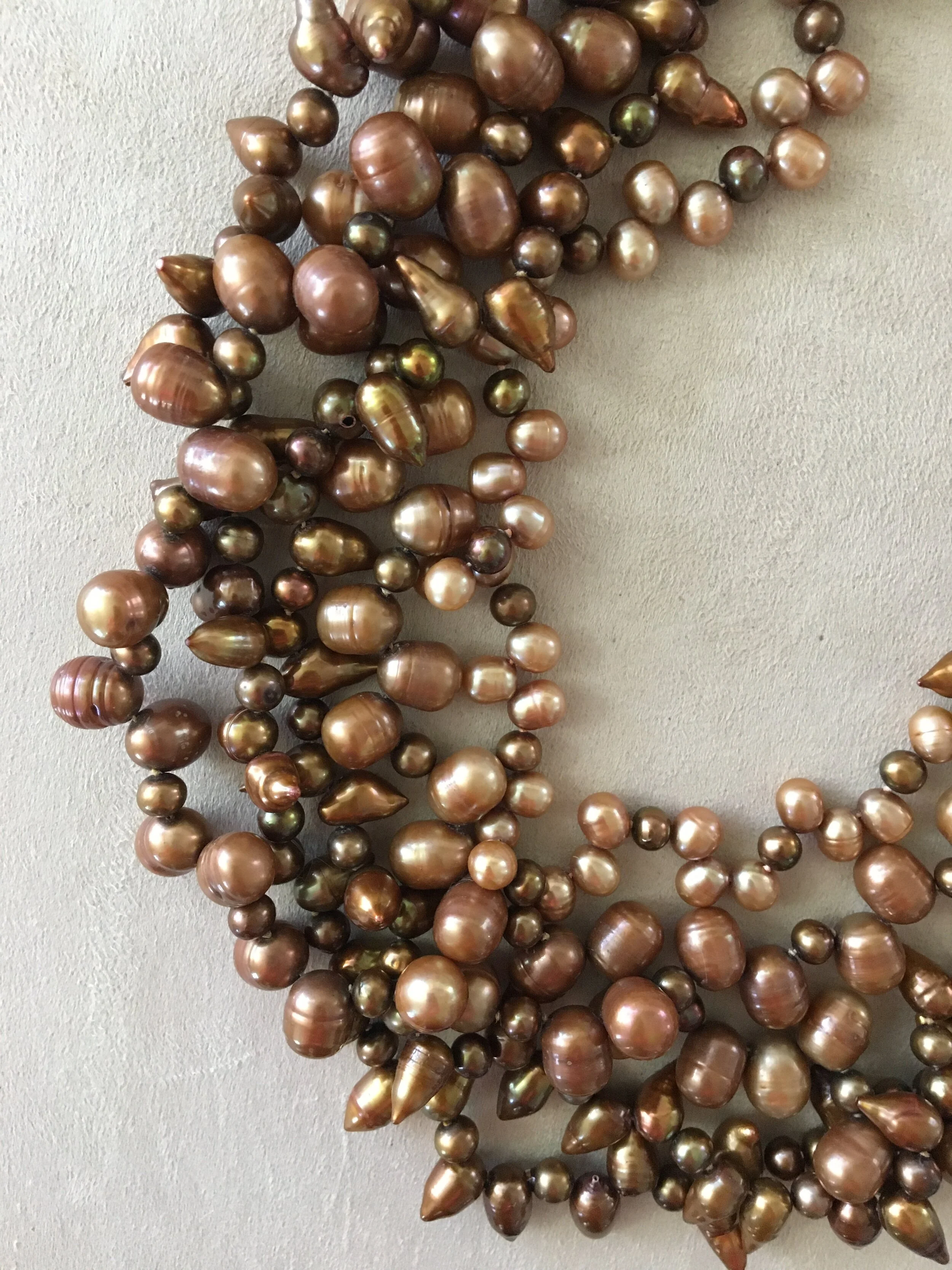 5 strands of top-drilled exquisite golden and bronze pearls. wear hanging graduated or twist for a dramatic collar. hues of brown, gold, peach, palest green are reflected in the light. strung on silk. sterling clasp. shortest strand is 18”