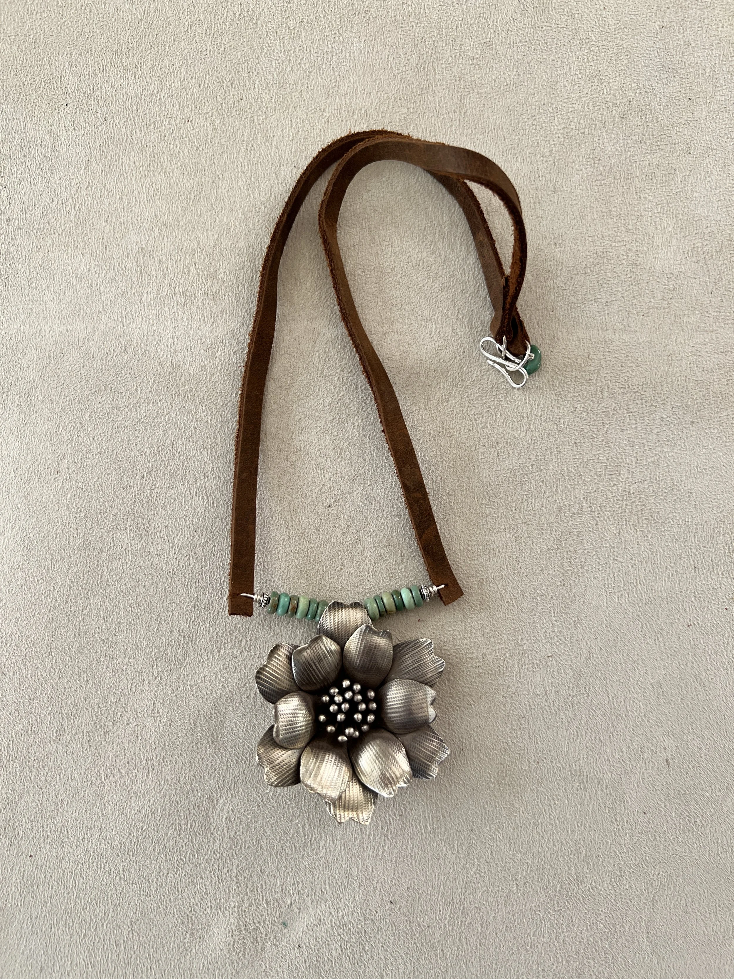one large collectible rare sterling silver artisan flower is all you need for a wow look. surrounded on either side by turquoise rounds, suspended from rawhide lengths. sterling silver hook clasp. 19.5”