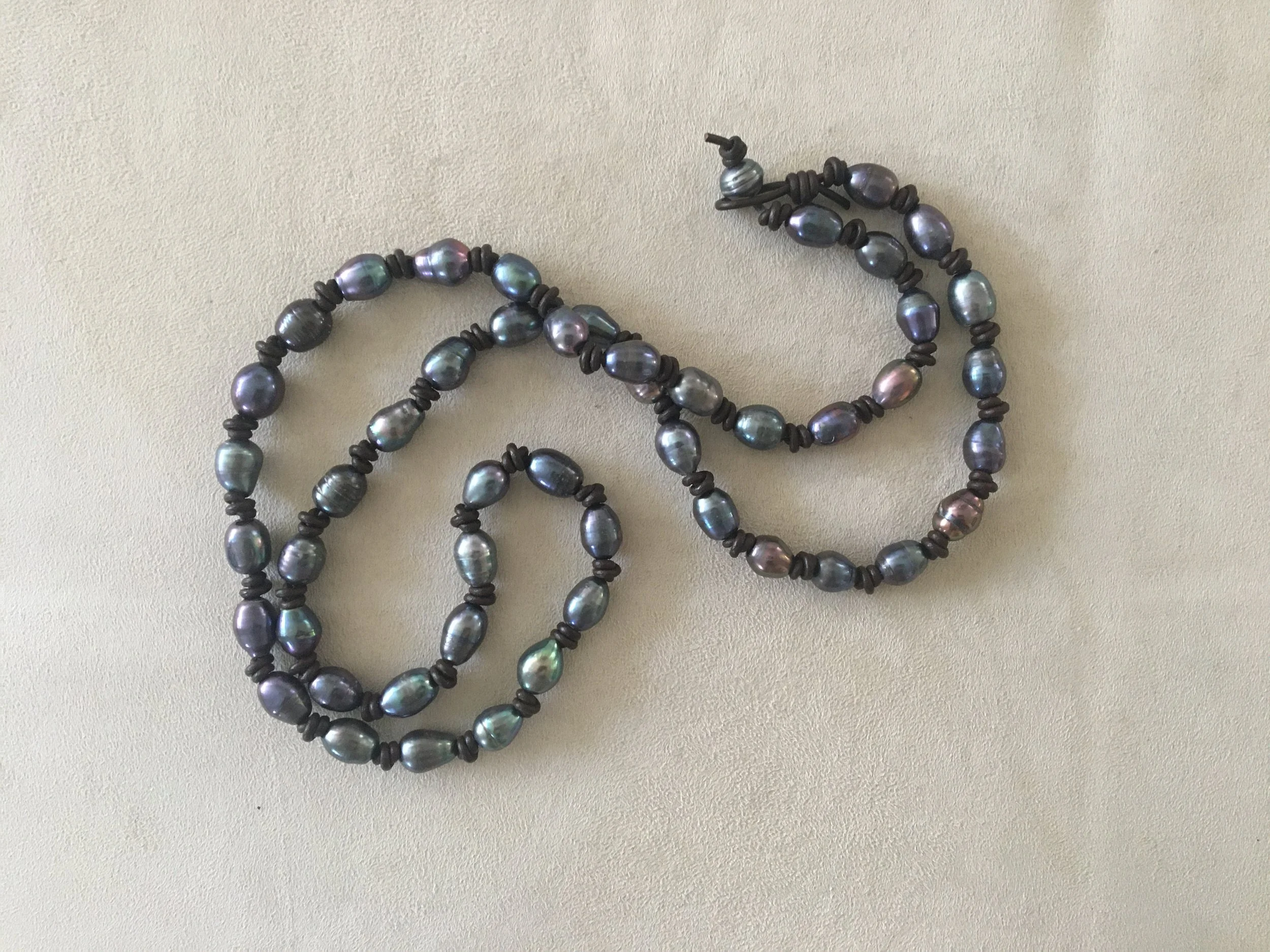 leather and pearls, red carpet to ranch! 37” length of beautiful blues, purples, taupe peacock baroque pearls strung and knotted on espresso soft leather. wear long or wrap around for a double strand necklace.