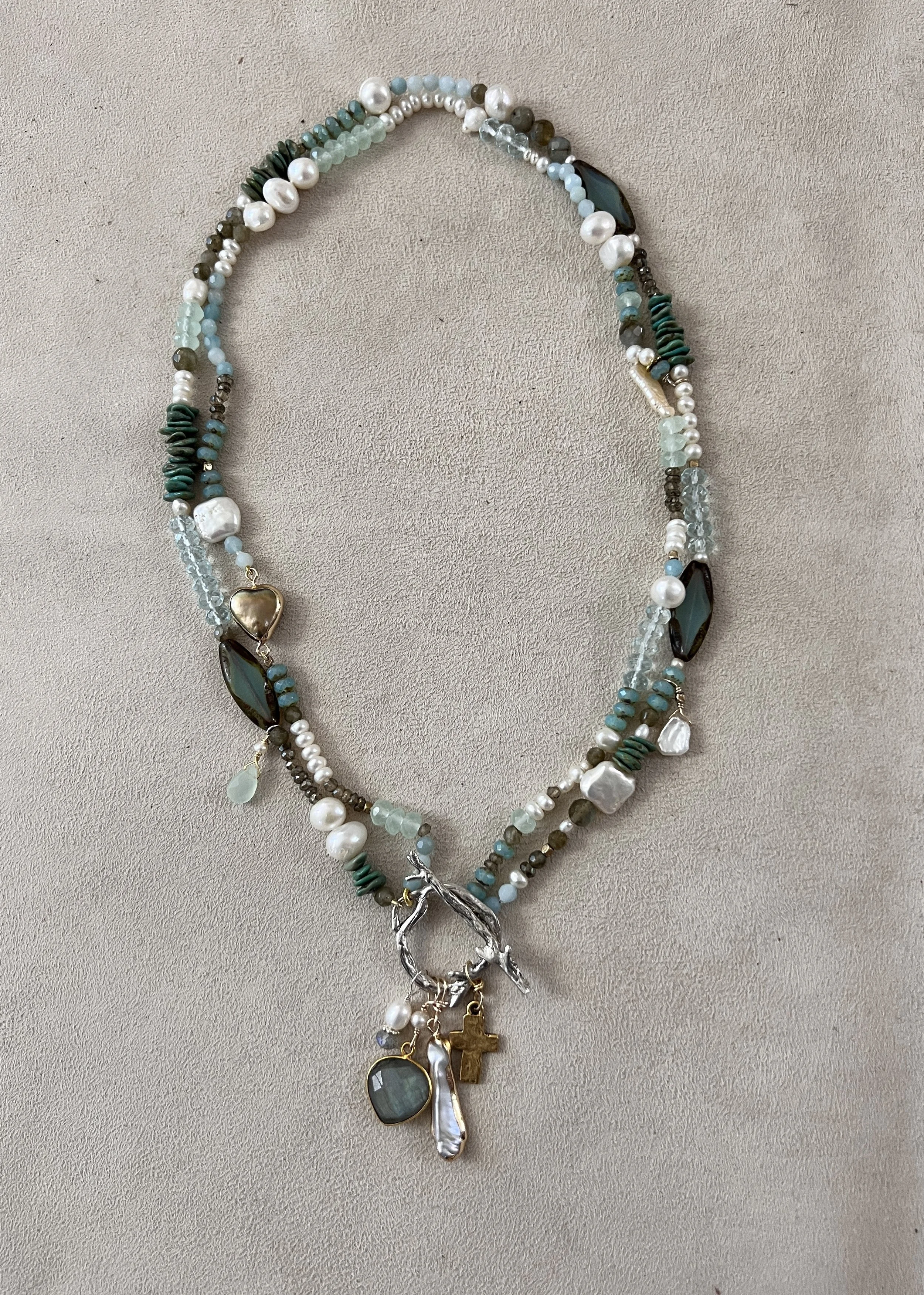 double strand beauty: pearls, blue topaz, labradorite, turquoise, peruvian opal, prehnite, and czech glass form this oh-so-pretty piece reflect of ocean and sky. strung and knotted on silk. gold filled and silver charms and clasp. 20”